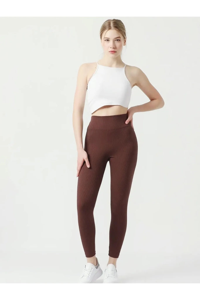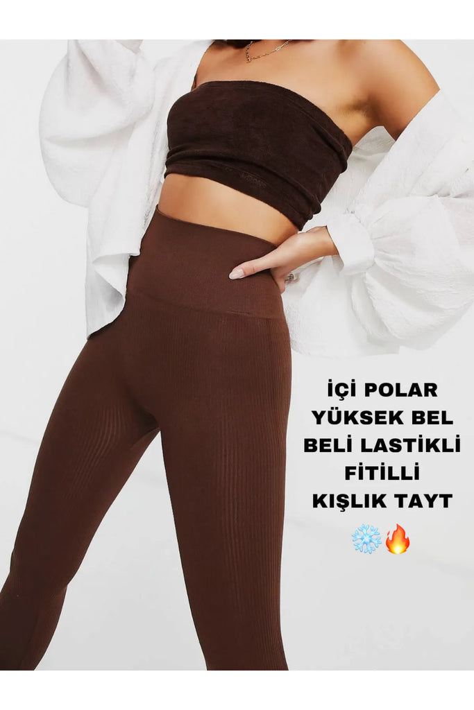 Kahverengi içi Polarlı, Lastikli, Şardonlu, Fitilli, Toparlayıcı Interlok Kışlık Örme Tayt