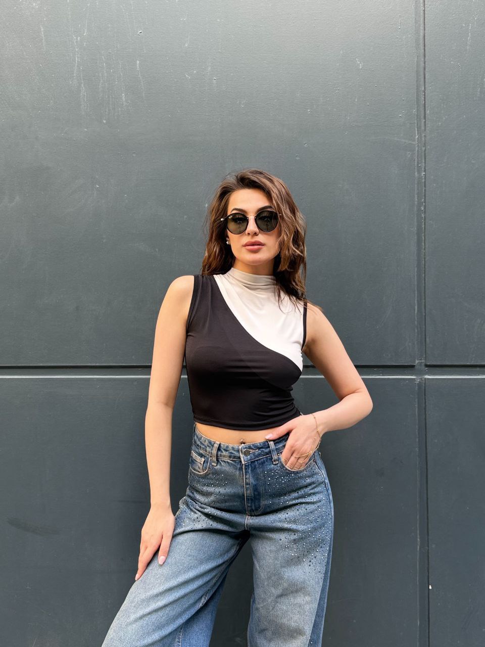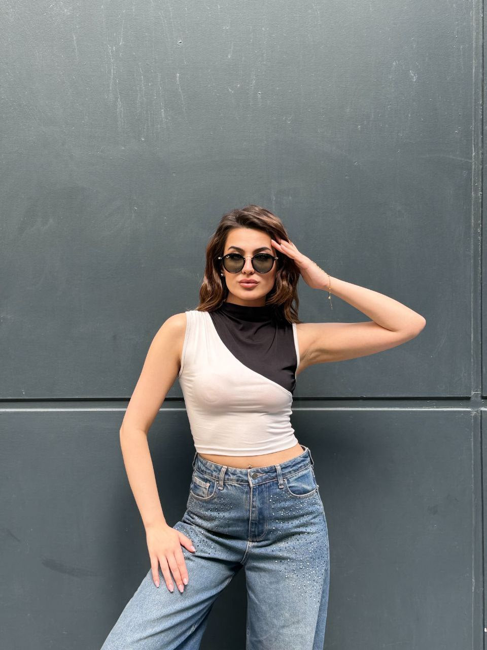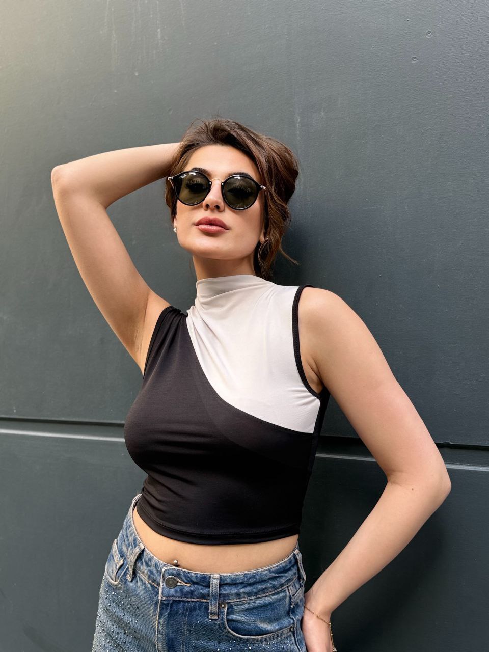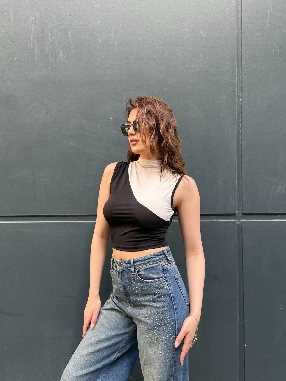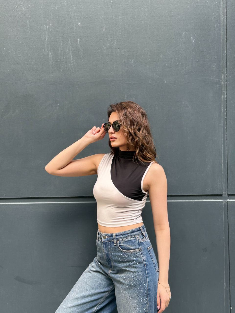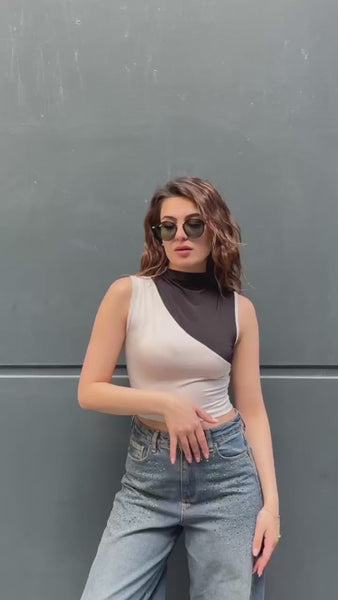 Modern çizgileri ve dikkat çekici renk blok tasarımıyla öne çıkan bu asimetrik crop bluz, stiline iddialı bir dokunuş katmak isteyenler için tasarlandı. Yarım balıkçı yaka detayı ve vücuda oturan esnek kumaşı sayesinde hem konforlu hem de şık bir görünüm sunar. Günlük kombinlerde jean pantolonlarla spor bir hava yakalayabilir, akşam kombinlerinde ise topuklu ayakkabı ve aksesuarlarla daha sofistike bir stil oluşturabilirsiniz. Zamansız siyah ve nude tonlarının uyumu sayesinde gardırobunuzun vazgeçilmez parçalarından biri olmaya aday. Şehir hayatının enerjisini stilinize yansıtın.