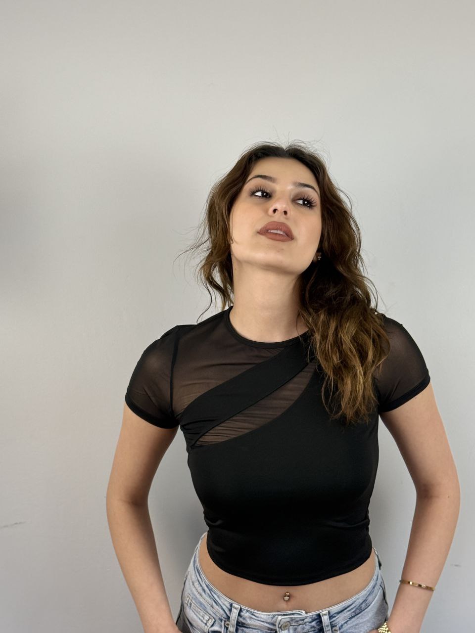 Asimetrik kesim, hafif transparan dokunuşlar ve mükemmel kalıp; görünümü vurgular ve etkileyici bir siluet oluşturur.